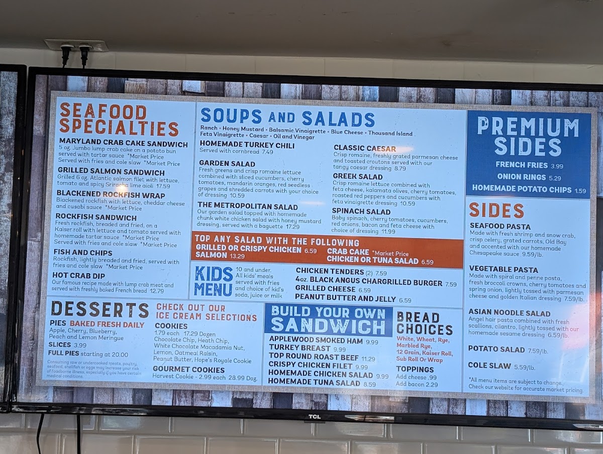 Fresh rockfish, breaded and fried, on a Kaiser roll with lettuce and tomato served with homemade tartar sauce. Served with fries and cole slaw