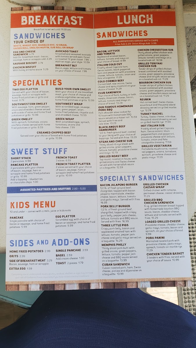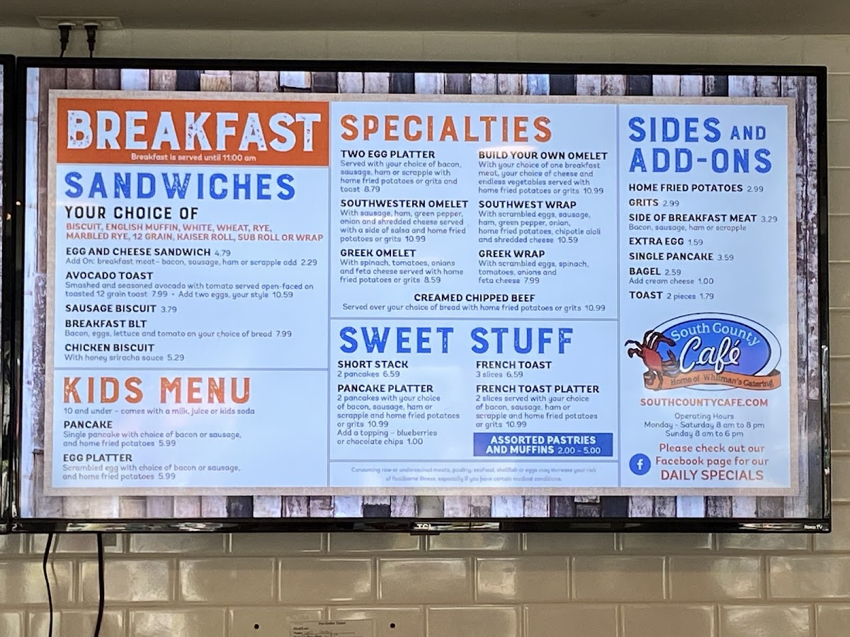 Served with your choice of bacon, sausage, ham, or scrapple with home fried potatoes or grits and toast